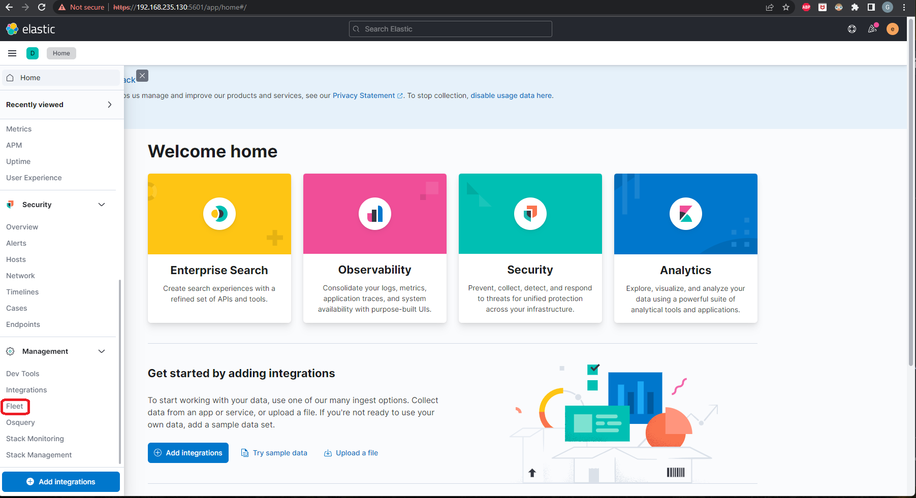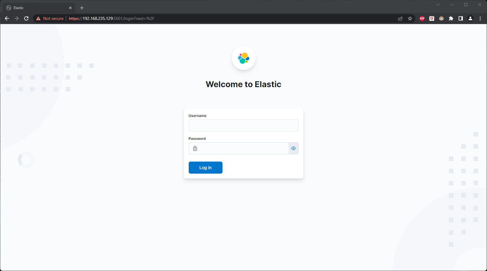 If everything worked correctly, you can open up a browser on your host and type in https://SERVER_IP:5601. You should be greeted with a “Your connection is not secure” warning. That’s okay, because these are self-signed certificates that you created. Accept the risk and proceed to starting out with Elastic!