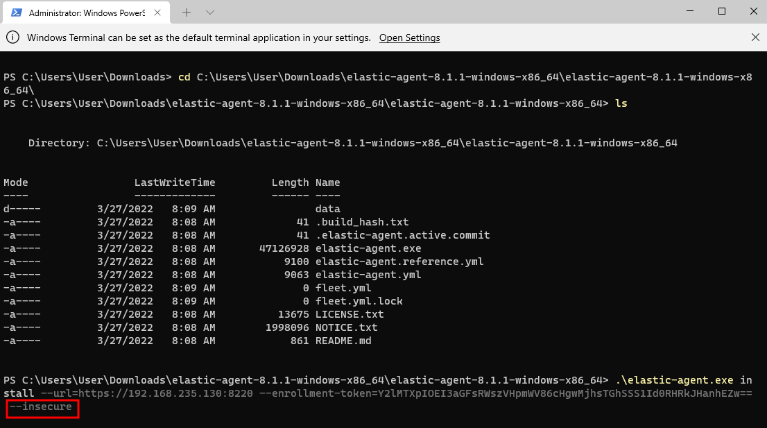 Now we’ll follow this guide to setup TLS communication with the fleet server. Elastic Agents require a PEM formatted certificate so we’ll start off with creating a CA for our fleet server certificates: