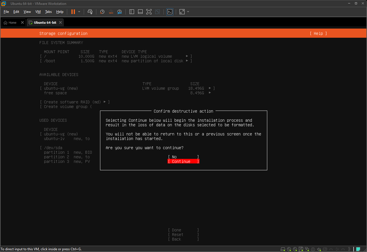Proxy addressblank, leave theMirror addressalone, keep the storage configuration to what it is, and finally click Done. It will ask if you are sure you want to continue. Cick continue.![]()
