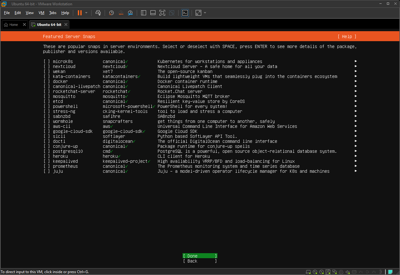 On the next page you can install some popular server snaps. I’m not going to install anything extra now. I’ll worry about that later. Click Done and wait for everything to update. Once the update is finished,